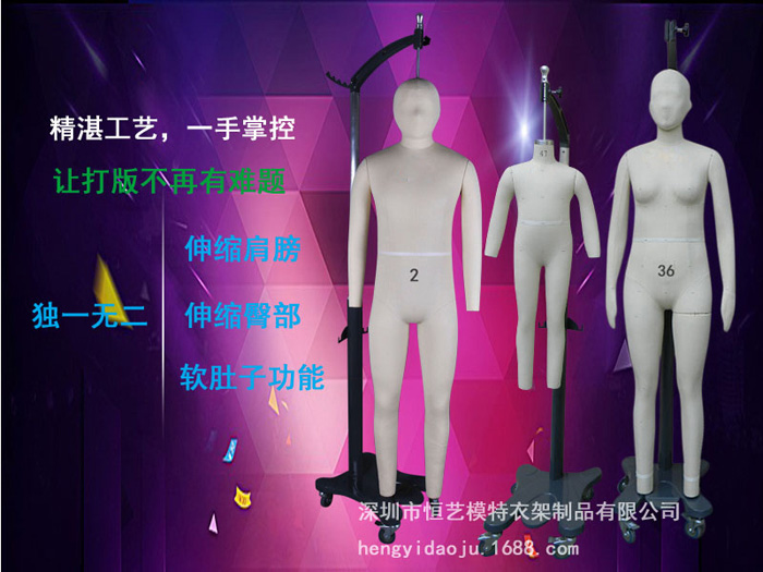 深圳市恒艺模特衣架子制品有限公司,本厂拥有10几年定制经验,积累几千套3D人体扫描数据和版型。 本司的制衣板房模特儿采用进口的玻璃钢纤维及进口的树脂制造,坚固耐用,尺寸标准、易插针、可伸缩肩膊,货架亦可升降、高级功能(软肚皮、伸缩臀、全身标红线、拆卸腿、高档吊架、尺寸定制)。同时可按客户提供的尺寸订做。 服装立体裁剪与制板是服装设计环节中重要的设计表现方法。它能直观地再现板型,同时也为制板提供精准的数据。也就是说,服装立体裁剪与制板是使服装设计作品完美再现与实现的最有力的表现手段。世界著名服装大师流传久远的经典作品无一不是用立裁的方法来表现的。 凭着创新的款式、优良的品质,我厂产品已远销至欧美。